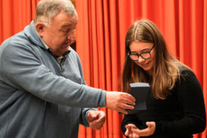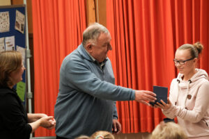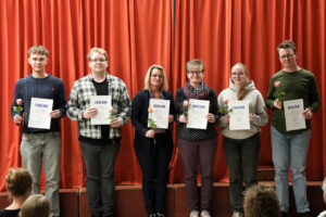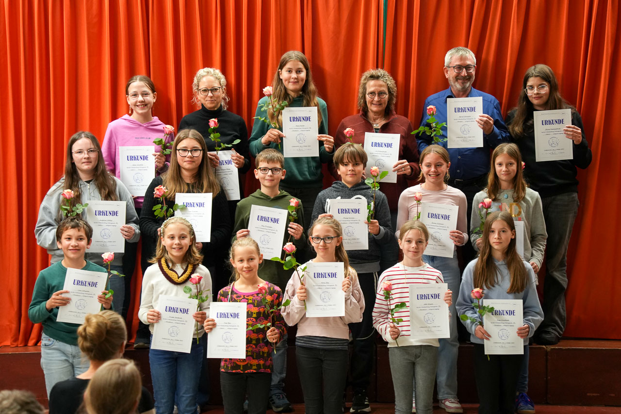 Unsere besten Prüflinge wurden mit einem Pokal (gestiftet von der Maschinenfabrik Ahlborn) ausgezeichnet: Lisa, Laila und Moritz freuen sich über die edlen Glaspokale. Sonderpreise (gestiftet vom Duo Lorch) wurden an Ylva, Alma und Julian vergeben.